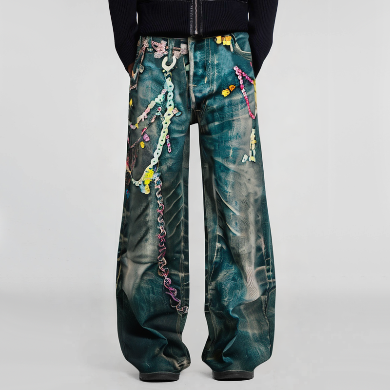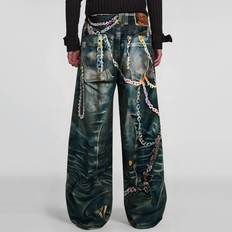 Digital Printing Loose Wide-Leg Men’s Cotton Jeans Product Details This pair of men’s jeans is made of 100% cotton fabric, combined with advanced 3D digital printing technology, showing a unique and layered print pattern. The pants are designed to be loose and wide-leg, comfortable and comfortable, in line with the current fashion trend, and both casual and individual. The fabric is soft and skin-friendly, breathable, suitable for daily wear and a variety of casual occasions, creating a relaxed and stylish men’s look.Feature 1. Pure cotton material: Selected 100% pure cotton fabric, soft and comfortable, breathable and sweat-absorbent, suitable for long-term wear. 2. 3D digital printing process: Using high-precision digital printing technology, the pattern is rich in details, the color is full and not easy to fade. 3. Loose wide-leg design: The loose wide-leg version provides excellent activity space and comfort, and creates a fashionable silhouette. 4. Strong durability: The pure cotton material is durable and suitable for multiple daily wear and washing. 5. Suitable for multiple occasions: Whether it is leisure, street or outdoor activities, it can be easily controlled.