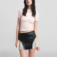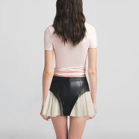 This black patchwork design mini skirt, inspired by the minimalist style, fully demonstrates the confidence and competence of modern urban women. The whole skirt is made of high-quality polyester woven fabric, with a crisp texture and neat style, presenting a very modern visual effect. The front center zipper design is not only convenient for wearing and taking off, but also adds a street coolness and personality tension in the details.