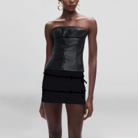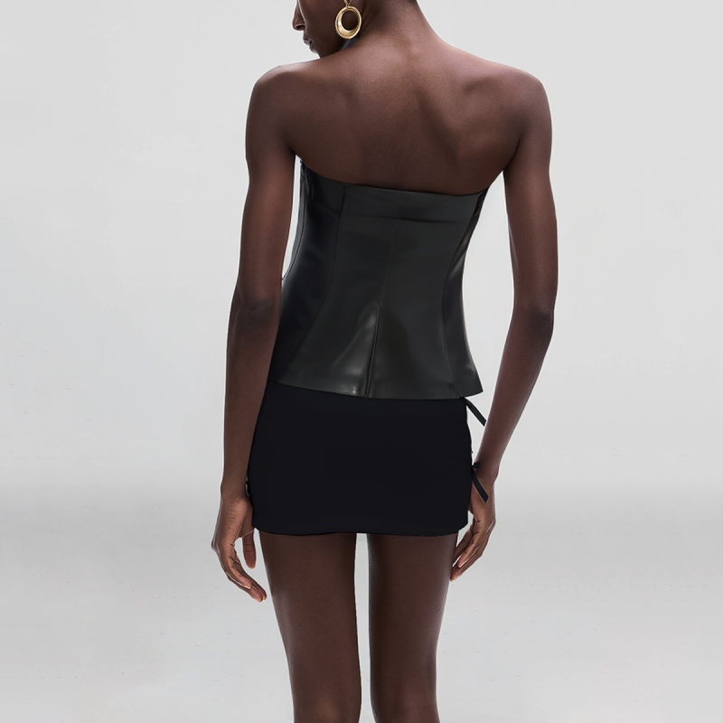 This women’s cut-out vest is mainly in modern black, with a strapless design to create a clean upper body line, showing the beauty of the neck and shoulder contours. The fabric has a leather texture and luster, and the front zipper fly decoration gives the overall shape a fusion of light punk style and urban cool. The short cut outlines the exquisite waistline, whether it is paired with high-waisted pants or skirts, it can easily create a fashionable street style. Very suitable for daily street, night gatherings or parties and other occasions.