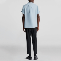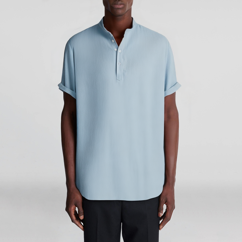 This short-sleeved shirt is made of high-quality polyester and cotton blended fabric, which combines the skin-friendly and breathable properties of natural cotton and the durable and wrinkle-resistant properties of polyester, ensuring comfortable wearing and not easy to deform. The surface of the shirt is treated with dyeing technology, the color is bright and long-lasting, and the striped design is simple and fashionable. The short-sleeved design is suitable for spring and summer, with moderate sleeve length, which improves overall breathability and comfort. The high-low hem design adds a sense of layering, which is in line with modern aesthetics and enhances the possibility of a variety of shirts. The combination of button and half-button design makes it easy to put on and take off while adding unique details, making the whole shirt more personalized.