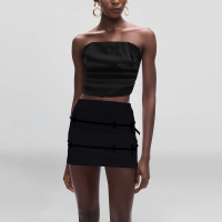This black strapless women’s vest is a summer fashion item that combines modernity and elegance. Made of lightweight all-polyester woven fabric, the fabric is crisp, and the pleated design adds layering and three-dimensional structure, making the whole garment more fashionable visually. The back zipper design is not only easy to put on and take off, but also adds personalized details and design sense. It is suitable for matching with high-waisted pants, skirts or denim shorts to create a neat and feminine look. The short cut highlights the waistline and creates a tall figure. It is one of the trendy vest styles that cannot be missed this summer.