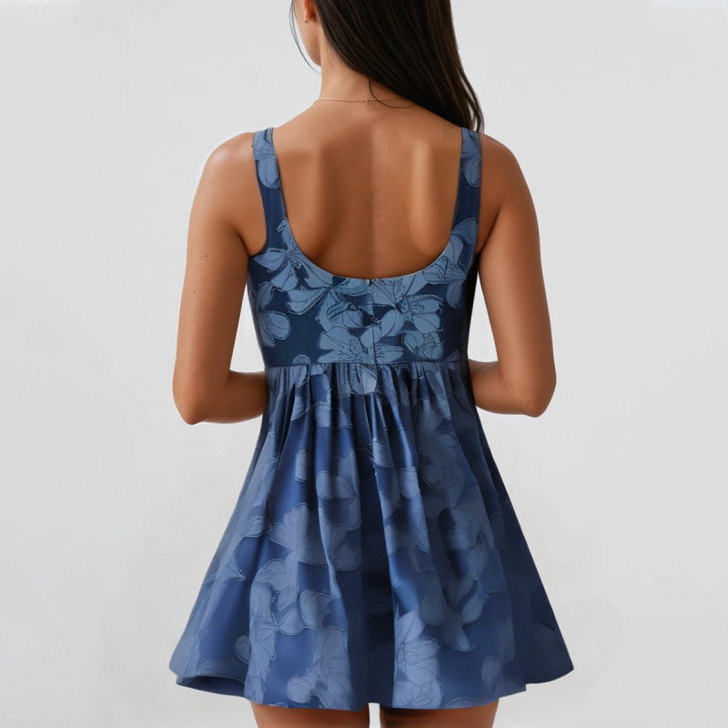 This blue printed spaghetti strap mini dress is a fashionable item for refreshing summer travel. The skirt adopts soft blue as the main color, with a smart floral pattern, presenting a fresh and natural visual effect, full of summer atmosphere. The thin sling design reveals the slender shoulders and clavicle lines, highlighting the gentle temperament of women; the collarless design is neat and simple, making the overall shape more light and agile.