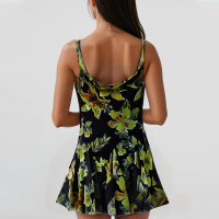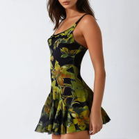 This printed yellow mini dress is a popular casual fashion item in summer. It is made of light and breathable woven polyester fabric with a soft and crisp texture, which is cool and comfortable to wear. The thin sling design outlines the clavicle and shoulder lines, creating a light and sexy summer atmosphere. The skirt is mainly floral patterns, and the fresh and natural color matching complements the yellow background, which is bright and eye-catching, and full of vitality. The A-line skirt falls naturally, covering the flesh and slimming while modifying the leg lines. The waist adopts a natural waistline design, which does not restrict the body and can easily show the body curve. The overall style is casual, suitable for daily shopping, dating, seaside vacations and other scenes, and it is easy to create a refreshing summer outfit.