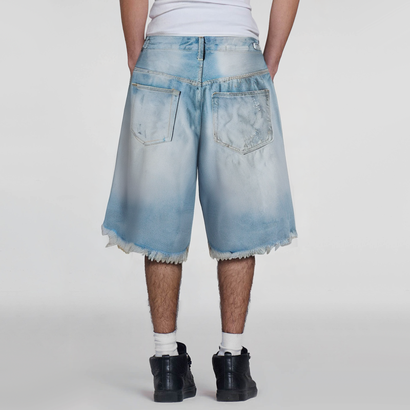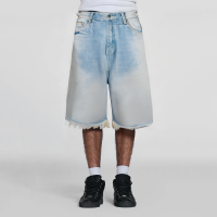 This thick retro washed distressed denim shorts is made of high-quality polyester/cotton blended denim. The fabric is thick but not stiff, with good crispness and support, which is very suitable for urban men who pursue both texture and style. The shorts are made of retro washed and hand-distressed craftsmanship, showing natural whitening and distressed textures, with loose wide-leg tailoring, showing an unconventional street attitude and men’s straightforward charm.