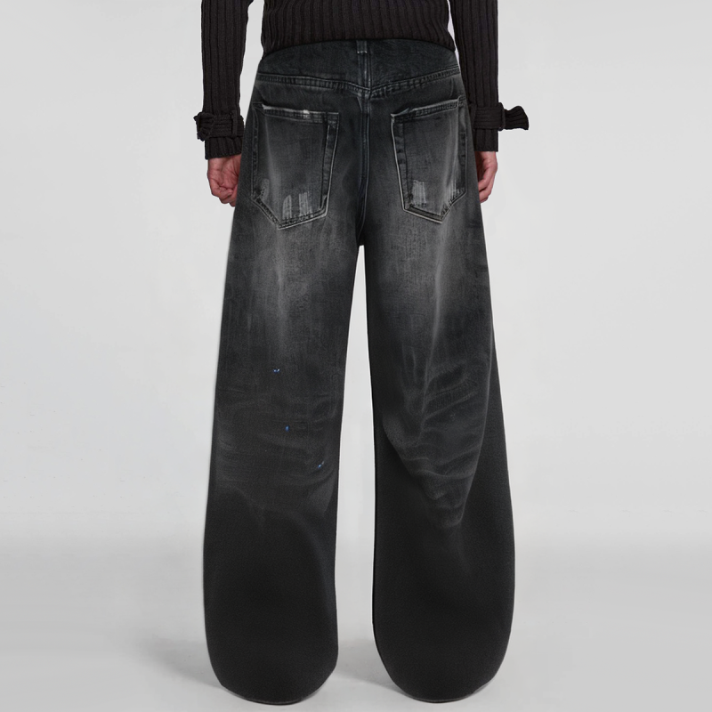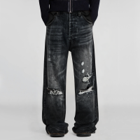 This pair of men’s jeans is made of polyester and cotton blended fabric, combined with vintage washing process, presenting a unique distressed tearing effect, showing personality and fashion attitude. The wide-leg and loose trouser design not only provides excellent wearing comfort, but also creates a natural and smooth silhouette, suitable for men who pursue freedom and uninhibited style. The fabric is wear-resistant and durable, and is both practical and trendy. It is a perfect choice for daily leisure and street style.
