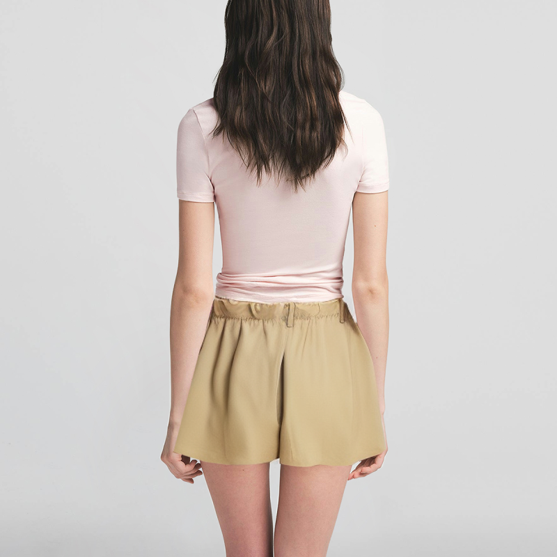 The shorts adopt a mid-waist design, which is ergonomic, modifies the waistline, and shows a natural and elegant body curve. The pants are regular straight, taking into account comfort and neatness, suitable for different body types. The trousers are equipped with zipper flies and practical side pockets on the side, which are convenient for carrying small items, combining functionality and detail beauty. The zipper design increases the overall sense of fashion and is easy to put on and take off.